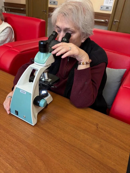 Занятие вызвало настоящий ажиотаж! Рассматривая чешуйку лука или волокно ткани, наши проживающие не только узнавали новое, но и делились историями из жизни, вспоминая свои школьные годы.