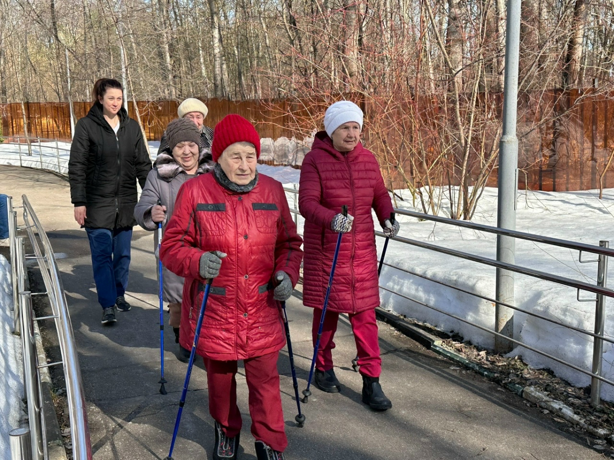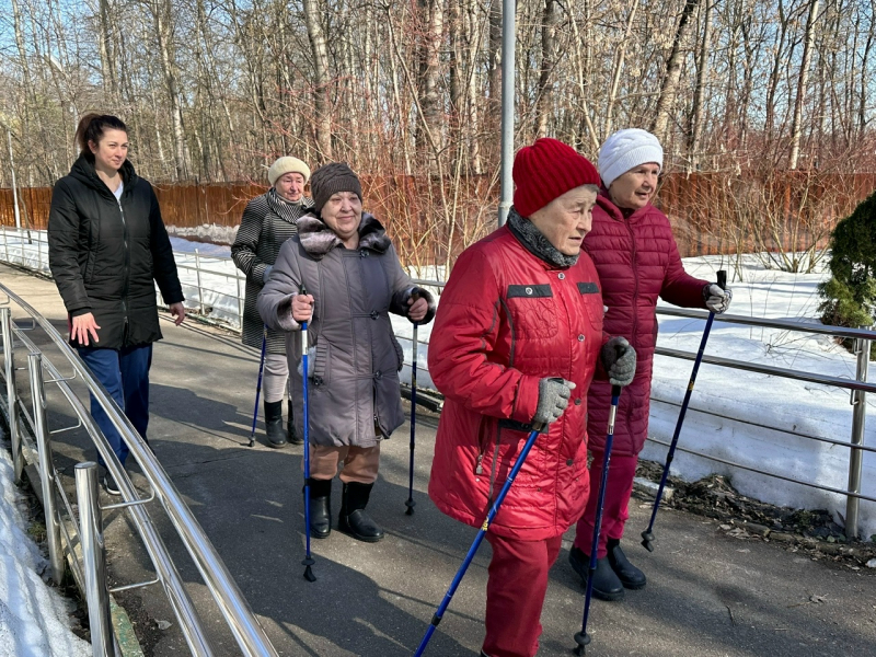 В нашем Центре мы продолжаем ежедневные занятия скандинавской ходьбой. Для наших жителей это уже не просто полезная привычка, а настоящий ритуал бодрости и отличного настроения.
