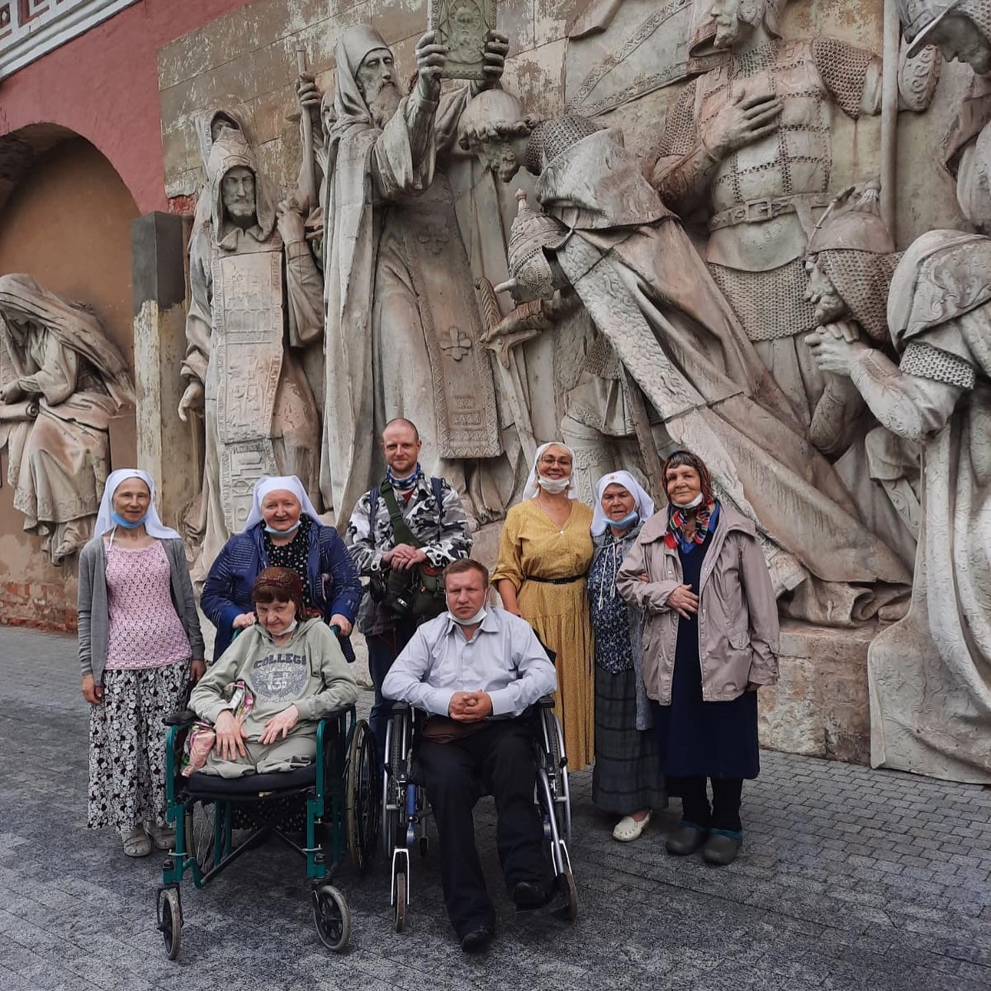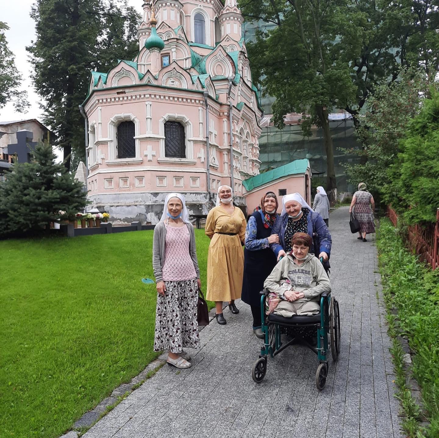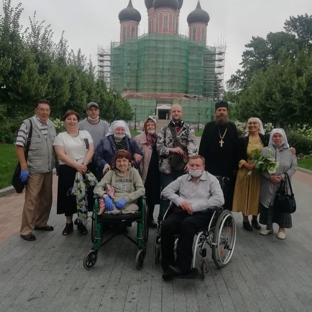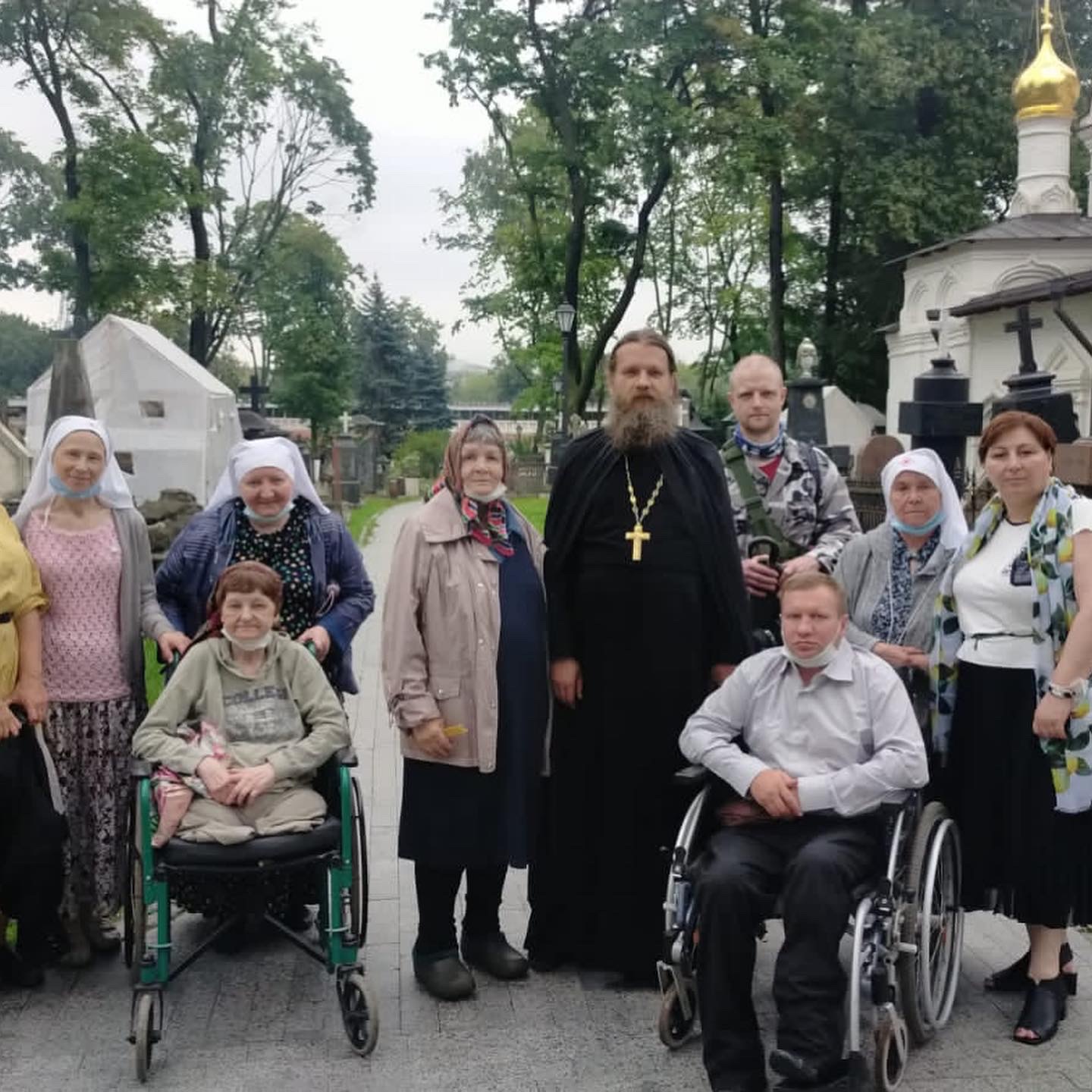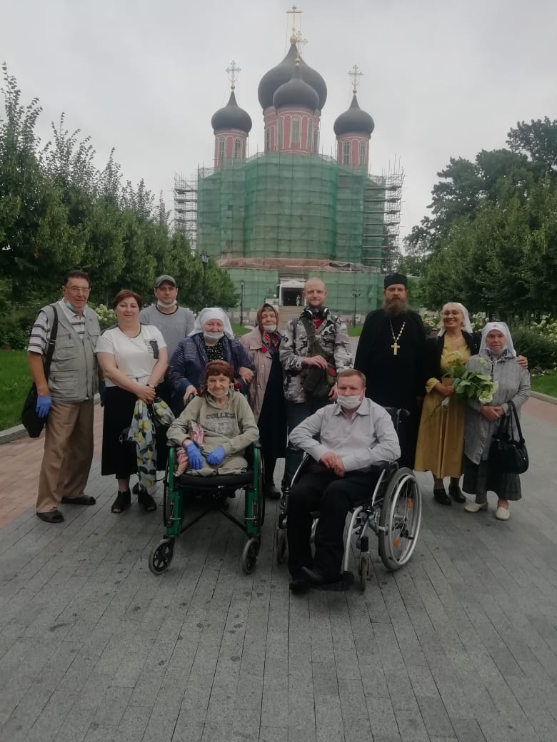 Иеромонах Косьма был нашим гидом по монастырю. Его попечением, наш автобусик беспрепятственно проехал на территорию обители и припарковался так, чтобы перед нами оказались самые ровные тропинки. Бабушки легко шагали по широким мощенным дорожкам, а сестры легко везли колясочников.