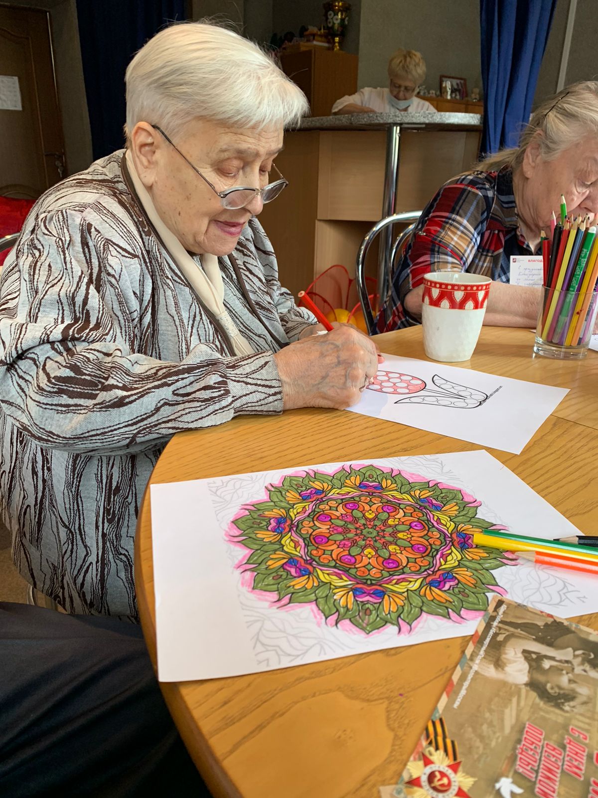 "Как психологи с помощью арттерапевтических мероприятий, помогают ветеранам комфортно адаптироваться в стационарном учреждении " .Денисова Надежда Викторовна переведена в ГЦ"Северное Тушино " в 2020 году из ГЦ "Дмитровский" (бывший ПВВТ"Турист") .Период адаптации проходил сложно ,она с трудом социализировалась в новых условиях жизни , новой обстановке.Сотрудники ГЦ окружили Надежду Викторовну искренним вниманием , участием и заботой.Психологи помогли снять тревожность и найти взаимопонимание с другими проживающими.Надежда Викторовна стала активно заниматься декоративным творчеством .Она увлеклась шитьем,вязанием на спицах,вышиванием,изотерапией,конструированием на различных мастер-классах. Сегодня мы собрались изготовить к весеннему празднику куклу-оберег «Масленица». Эта кукла служит защитницей дома,привлекает удачу, укрепляет здоровье. Надежда Викторовна для пошива оберега подобрала яркие, пестрые лоскутки, кружева, ленты,тесьму, нитки-мулине."Изготавливая такую чудесную куклу-сувенир,я представляла её красочной, нарядной ,веселой,радостной.Такой подарок воплощает дух весны и солнца".- говорит Денисова Надежда Викторовна.