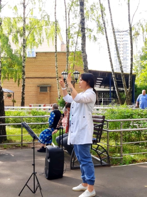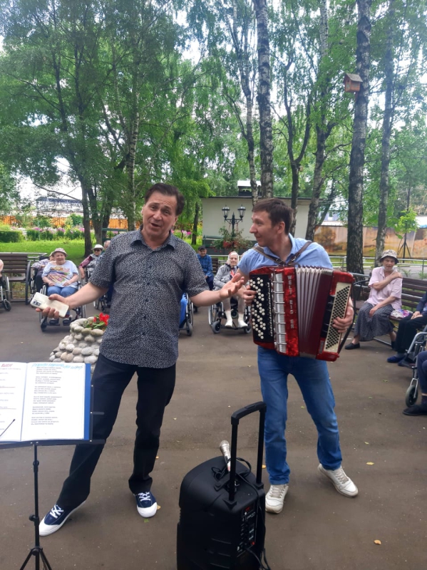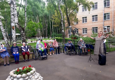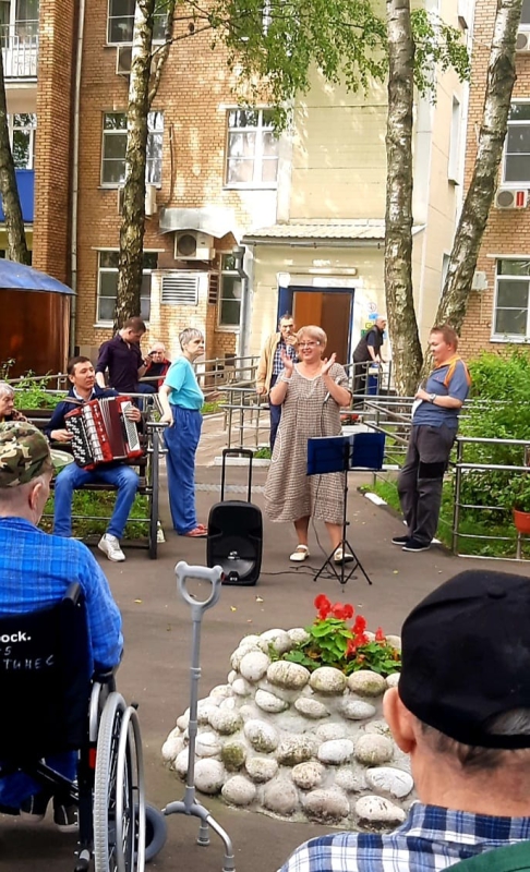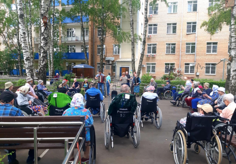 "Прогулки на свежем воздухе". Тёплые летние дни дарят нашим проживающим прекрасное настроение и повод для ежедневных прогулок на свежем воздухе. Жители нашего ГЦ с удовольствием проводят время на территории. Кто - то любуется красотой природы Алешкинского леса,кто - то занимается на тренажерах, кто - то занимается цветоводством, а любители живой музыки собрались тёплой компанией исполнить свои любимые песни под баян.