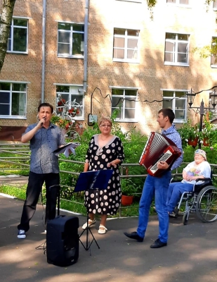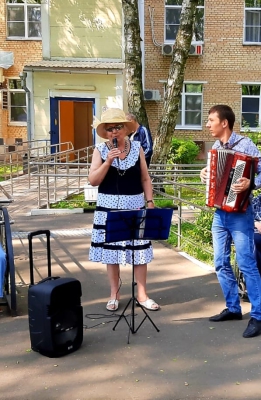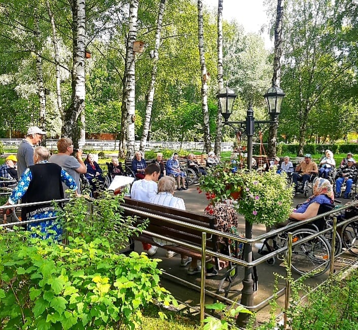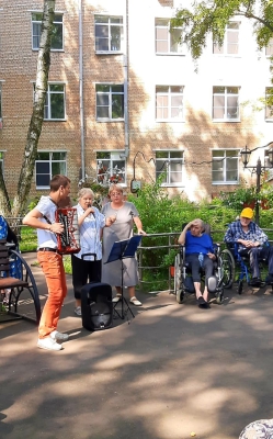 " Поющие сердца". Проживающие нашего ГЦ" Северное Тушино" в летнее время проводят большую часть времени дня на прекрасной ,ухоженной территории, окружающей наш дом. Замечательные цветники, газоны, удобные лавочки , качели, красивый фонтан- все располагает у отдыху и релаксации. Ветераны могут заняться любым творческим делом на свой вкус: прогуляться по удобным аллеям, отдохнуть в тени елового леса, пообщаться с друзьями, найти уютный уголок и почитать на свежем воздухе увлекательную книгу или газету.Многие проживающие с удовольствием занимаются лечебной физкультурой, что способствует укреплению иммунитета и поддержанию общего состояния организма в прекрасном тонусе.А любители живой музыки, собираются на занятие в клубе " Поющие сердца",чтобы исполнить свои любимые песни под баян.