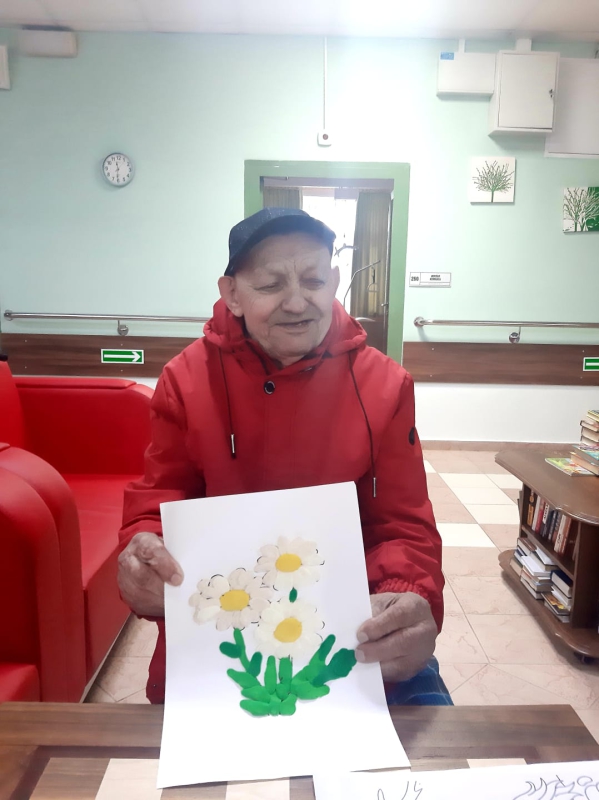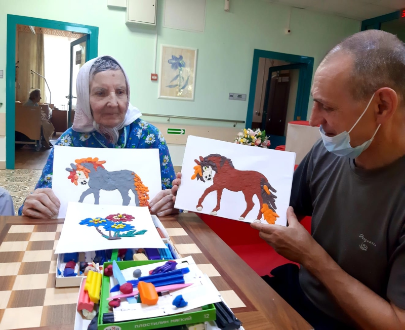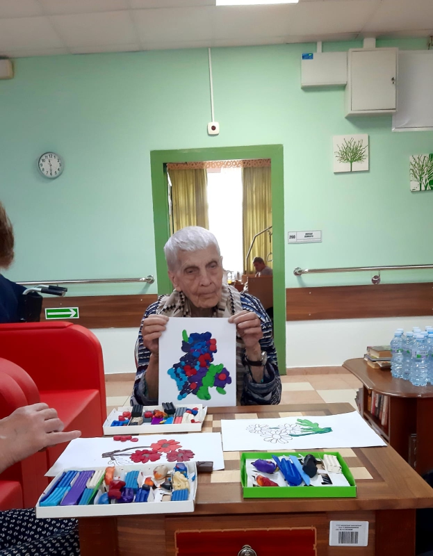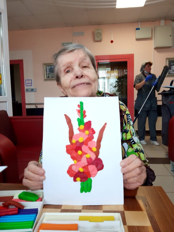 "Разнообразные занятия по прикладному искусству. "На занятиях проживающие могут провести время с удовольствием, а также раскрыть свои таланты в арт- терапии , лепке из пластилина и солёного теста, рисовании и многих других видах творчества." Творчество является отличным стимулом для нового витка жизни. Увлечение интересным занятием помогает с пользой проводить время, общаться и главное- сохранять на достойном уровне интеллектуальную и физическую форму",- говорит проживающая Царёва Зоя Васильевна.