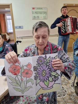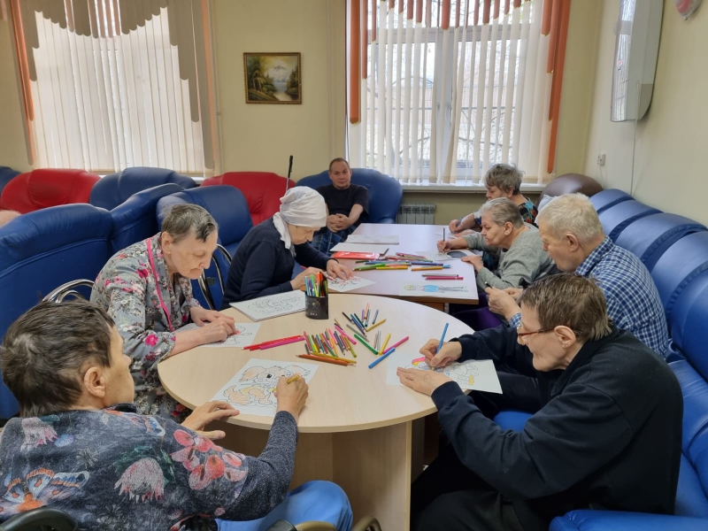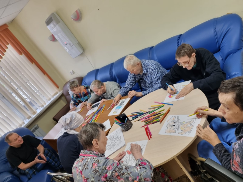 Раскраски для взрослых — самый простой способ рисовать, с ними рисовать не сложно, нужно лишь заполнять свободные ячейки цветами на свой вкус. Выглядят они как черно-белые картинки, но в отличие от детских раскрасок у взрослых великое множество тематик, от растений и животных до памятников архитектуры. Каждый человек в детстве рисовал, но многие пожилые люди на протяжении десятилетий не занимались рисованием. На наших занятиях для того, чтобы получить пользу, важен сам процесс творчества, а не техника, поэтому многие наши подопечные, несколько занятий наблюдая за нами и отказываясь от предложения присоединиться, в итоге берут карандаш и начинают творить! На первых порах вновь прибывшие участники выбирают раскраски из предложенных, но втягиваясь, у них появляются свои сюжетные идеи и задумки. И потом уже.... "бывшие новенькие" объясняют "новеньким", что любой вид творчества очень благоприятно влияет на организм в любом возрасте!