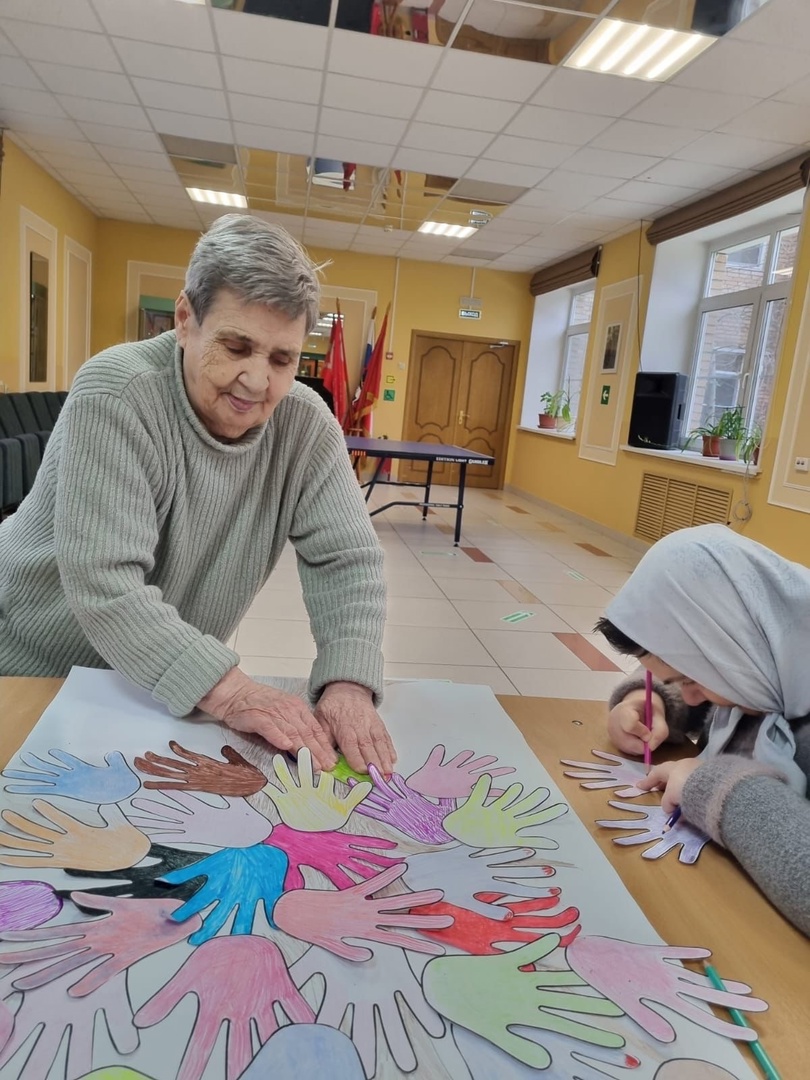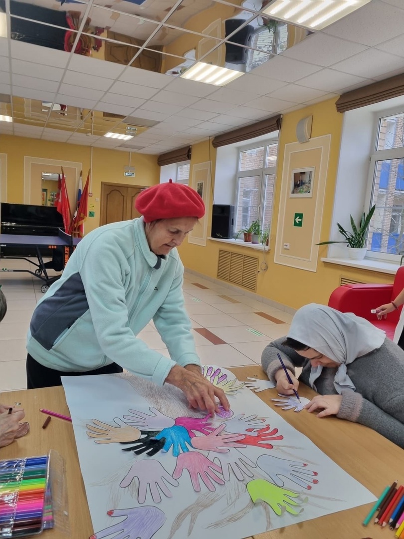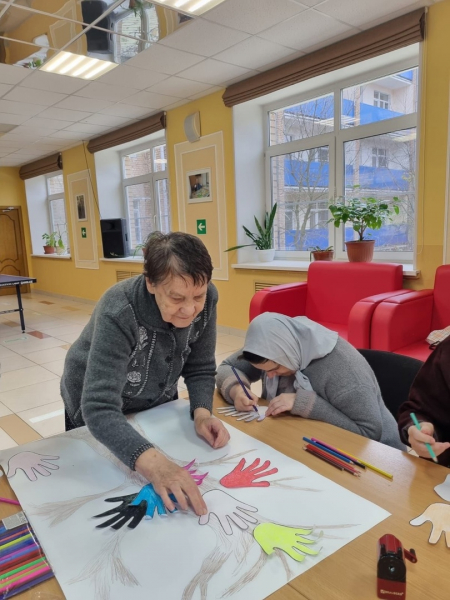 Накануне праздника проживающие Геронтологического центра «Северное Тушино» приняли участие в тематическом мастер-классе по изготовлению одной большой открытки.