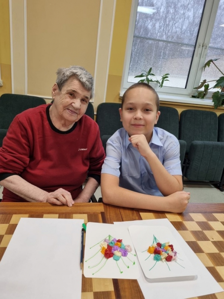 Пожилые люди встретили ребят с большой радостью! Они совместными усилиями изготавливали яркие поделки, и работа быстро спорилась! Дети были рады проявить себя и выполнили большую часть сложной работы.