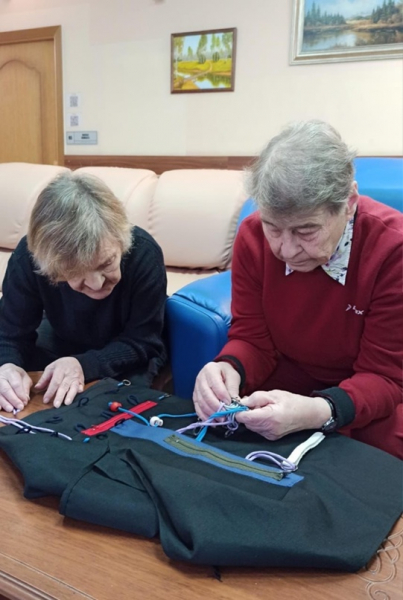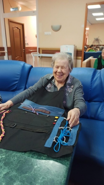 Тренировка крупной и мелкой моторики - одно из эффективных направлений профилактики деменции. Именно этой работе была посвящена очередная встреча психологического клуба "Жизнь в красках". Проживающие геронтологического центра "Северное Тушино" познакомились с интересным когнитивным тренажером под названием Эргофартук. Выглядит он как самый обычный фартук, но оснащен большим количеством функциональных мелких деталей. Застегивание и расстегивание пуговиц, молний и липучек, плетение косичек из шнурков, пересчитывание декоративных элементов - все эти незамысловатые операции развивают кору больших полушарий мозга, помогая поддерживать когнитивные функции в норме. Кроме того, это направление является отличной реабилитацией для людей, перенесших инсульт, и желающих восстановить мелкую моторику.