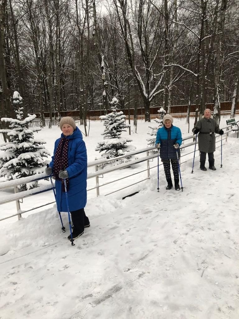 В нашем Геронтологическом занятия скандинавской ходьбой проводятся в любое время года. Одно из главных преимуществ зимней тренировки - это воздействие на организм большого количества свежего воздуха. Зимой он более насыщен кислородом, что позволяет нашим проживающим получать максимум пользы от уличных тренировок. С декабря по февраль людям особенно не хватает солнечного света. Благодаря прогулкам, проживающие восполняют эту нехватку солнечного света и получают заряд бодрости. Заниматься не только полезно, но и приятно, а прогуляться по снегу до появления румянца на щеках, очень здорово.