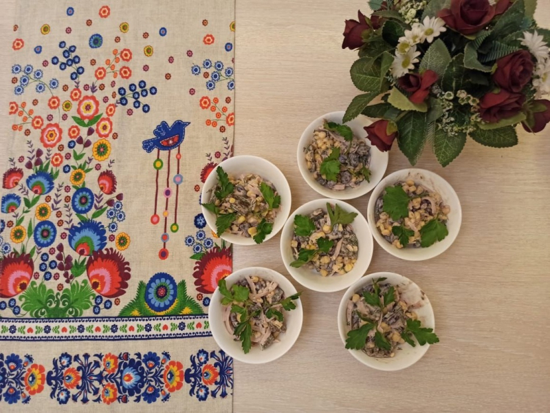 В кулинарной мастерской, наполненной ароматами свежих ингредиентов, участники клуба «Вкусно дома» приготовили новый салат «Зимнее настроение». Каждый шаг — от нарезки до подачи был пронизан вниманием к деталям.