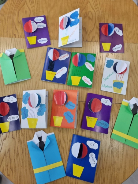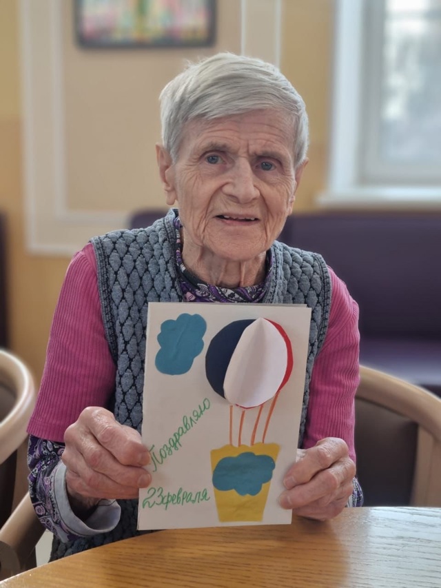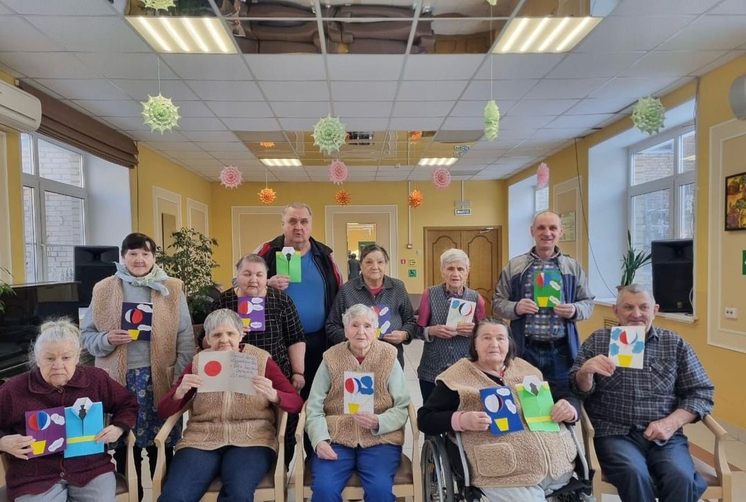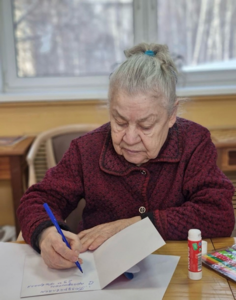 Участники мероприятия с удовольствием создавали свои шедевры с помощью цветного картона, цветной бумаги, фломастеров и клея. Внутри красочных открыток наши жители написали тёплые слова своим близким людям.