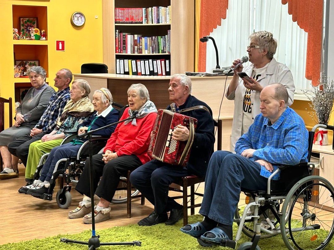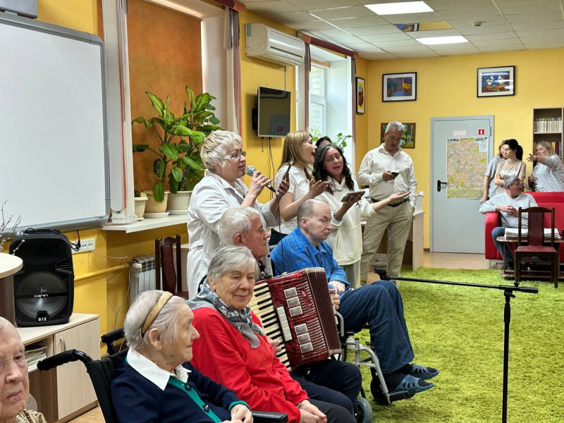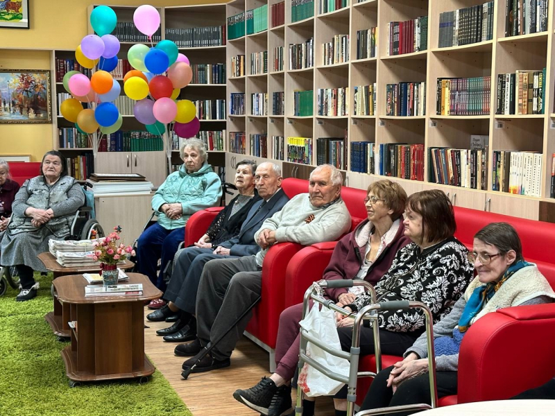 В преддверии 9 Мая команда волонтеров фонда «Старость в радость» приехала в Геронтологический центр «Северное Тушино», чтобы поздравить его жителей - ветеранов, тружеников тыла и детей войны — с Днем Победы, и устроить для них небольшой, но душевный концерт в библиотеке.