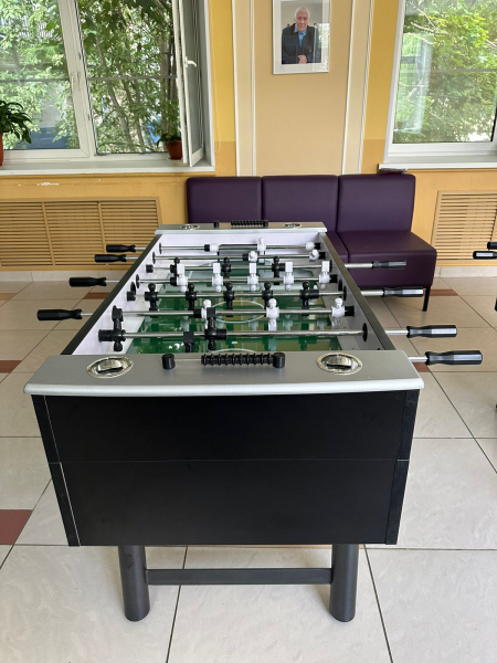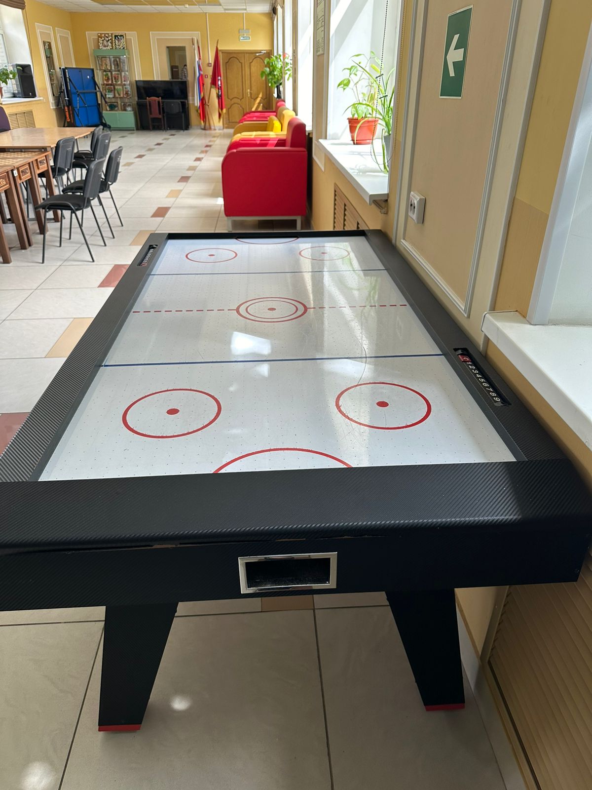 Аэрохоккей - увлекательное развлечение где игроки соревнуются на ловкость и быстроту реакции. Игроки гоняют круглыми плоскими битами с маленькими ручками по полю шайбу, стараясь забить противнику в ворота гол. Гонять шайбу по столу одно удовольствие, потому что она почти летит над поверхностью. Этот эффект достигается компрессором, который нагнетает воздух, вентиляторы его разгоняют и направляют сквозь отверстия в столешнице. Аэрохоккей веселая и затягивающая игра, поднимающая настроение нашим проживающим.