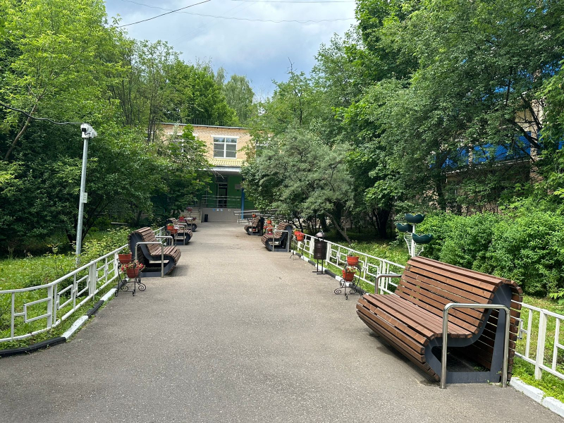 На территории учреждения созданы комфортные условия для прогулок на свежем воздухе наших подопечных. Одним из направлений адаптации уличного пространства для маломобильных людей является установка специальных скамеек, благодаря чему инвалидам, пожилым и просто ослабленным людям ими проще пользоваться. Рядом со скамейками и вдоль пешеходных дорожек установлены перила из нержавеющей стали для безопасных и комфортных прогулок.